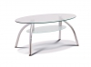 Стол журнальный TS 5329 имеет столешницу овальной формы, изготовленную из прозрачного стекла. Полка круглая стеклянная покрашена в оранжевый цвет. Стойки изготовлены из хромированного металла. Крепление столдешницы и полки по УФ-технологии.